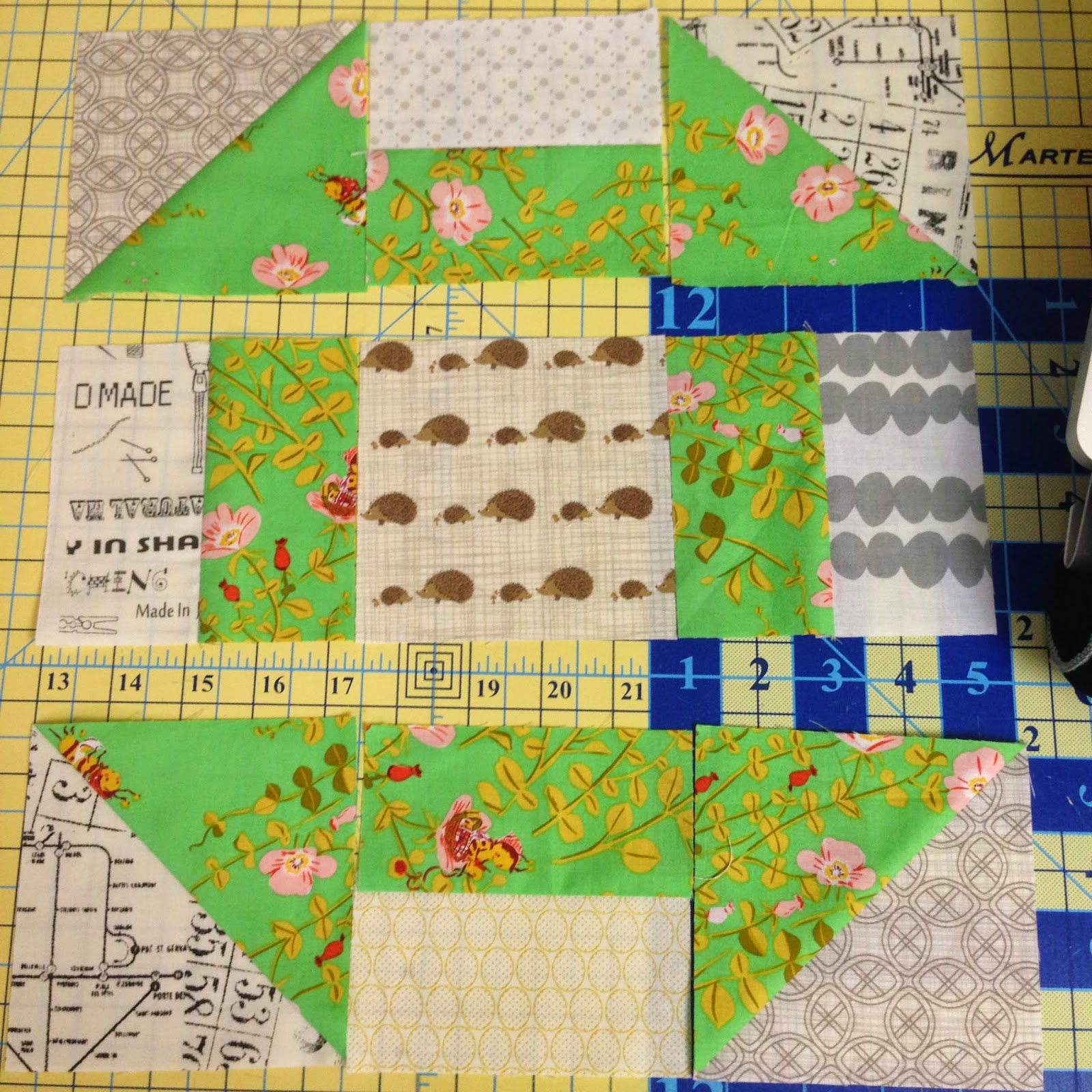 Now lay out your block as pictured above. There will be 4 HST for each block, and you will alternate as follows: Top row- HST with dark triangle down, rectangle unit with dark print down, HST unit with dark triangle down; Middle row- rectangle unit with dark print to the right, 4.5" low-volume/novelty print center, rectangle unit with dark print to the left; Bottom row-HST with dark triangle up, rectangle unit with dark print up, HST with dark triangle up.