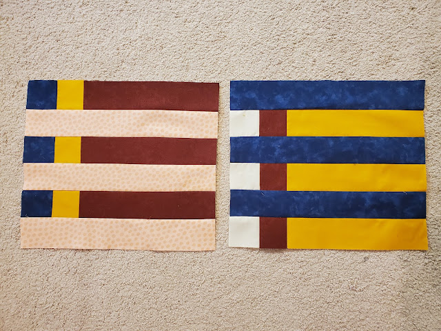 I really like the look of the block this month and with the jewel tone palette, it's going to make a beautiful quilt. Here is mine to add to the collection. It's hard to tell in the photo, but the colors are navy, light blue, maroon, and cream.