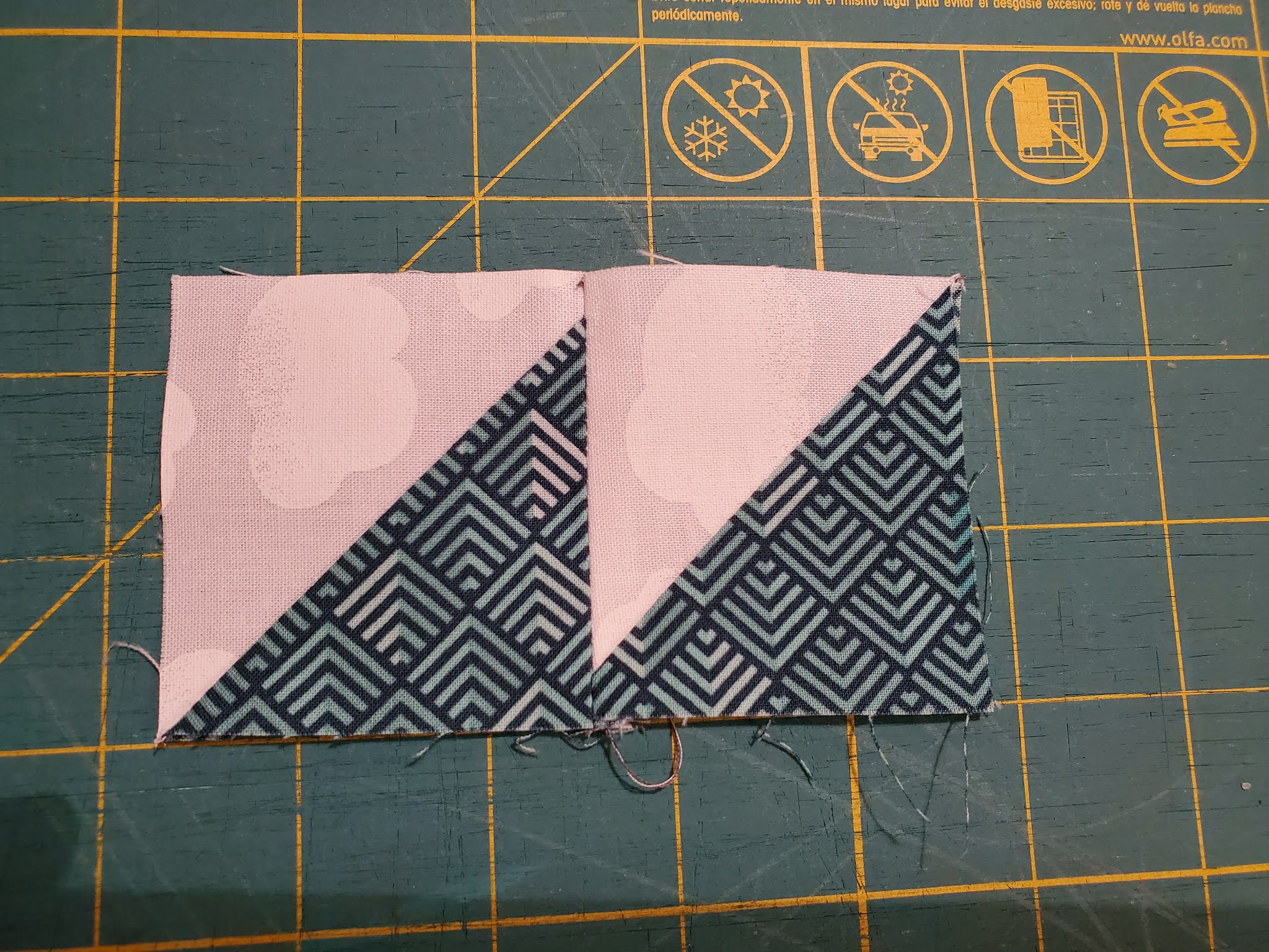 There are 2 methods for making HSTs that I will demonstrate. You can do the 2 at a time method, as per the original tutorial. Or you can do the 8 at a time method (way faster). Whichever method you choose will affect the cutting measurements.